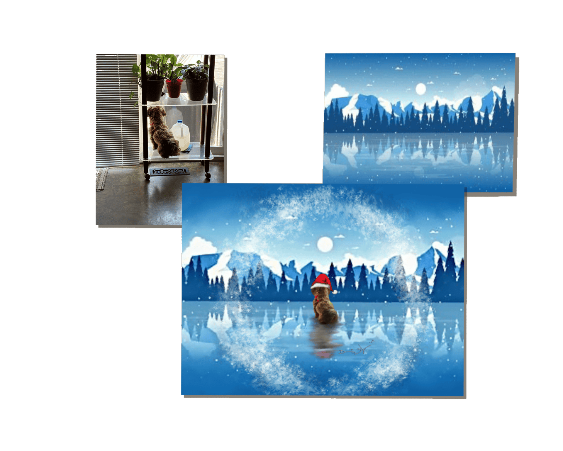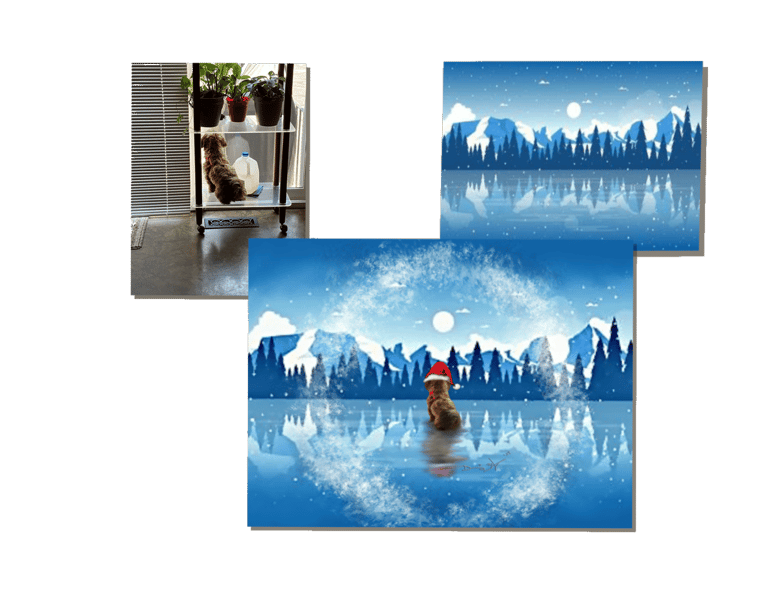Put your pet in a different photo or scenery! We can literally superimpose your cuddly buddies into other images or remove/add people or items. Whatever you would like (w/in reason!🤣).. A little more challenging but that’s part of the fun! As long as I have the photo or jpeg/png image, we can MOST LIKELY make it happen! We will consult & form a planツ