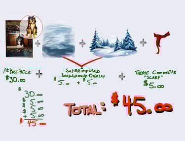T&C start @2nd BASE: 35.oo + $5.oo per composite addition/subtraction/ customization/ superimposed image overlay