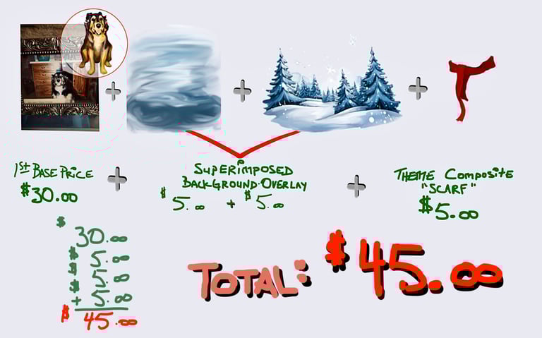 CUSTOM means CUSTOM so.. every piece will be unique unto itself & our shared vision! These require ADDING/SUBTRACTING elements (COMPOSITING) &/or blending multiple images (SUPERIMPOSING)