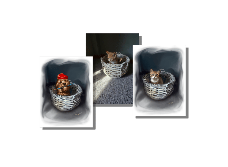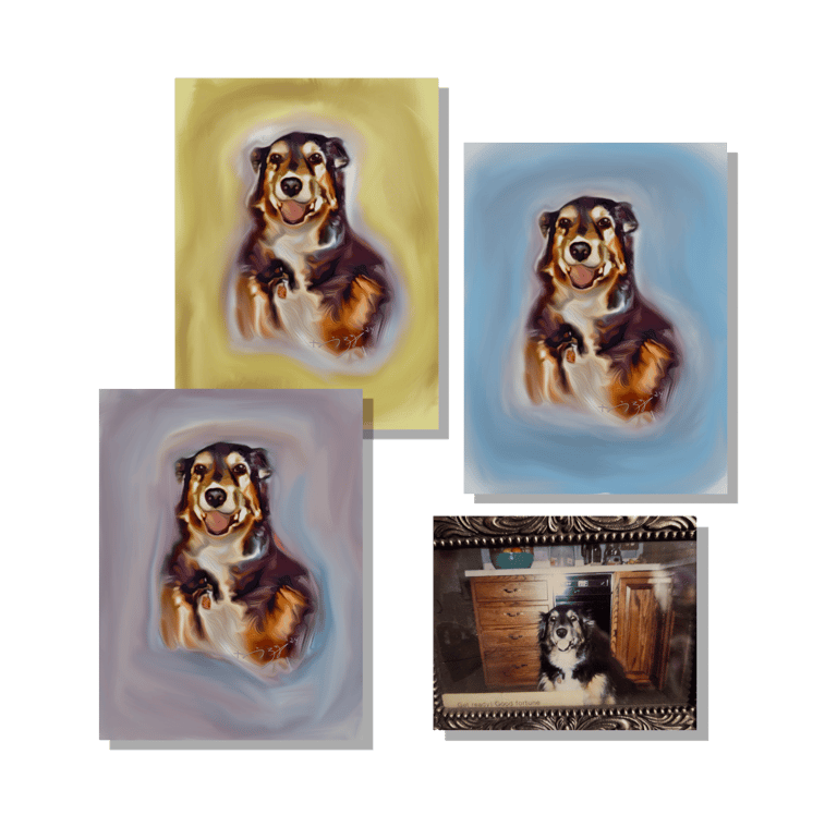 Here, I do Custom Pet Portraits from your pics. I use a style I call “Digital Photo-Semi-Realism” to playfully recreate pics using a variety of techniques & create Digital Print to Canvas Pieces